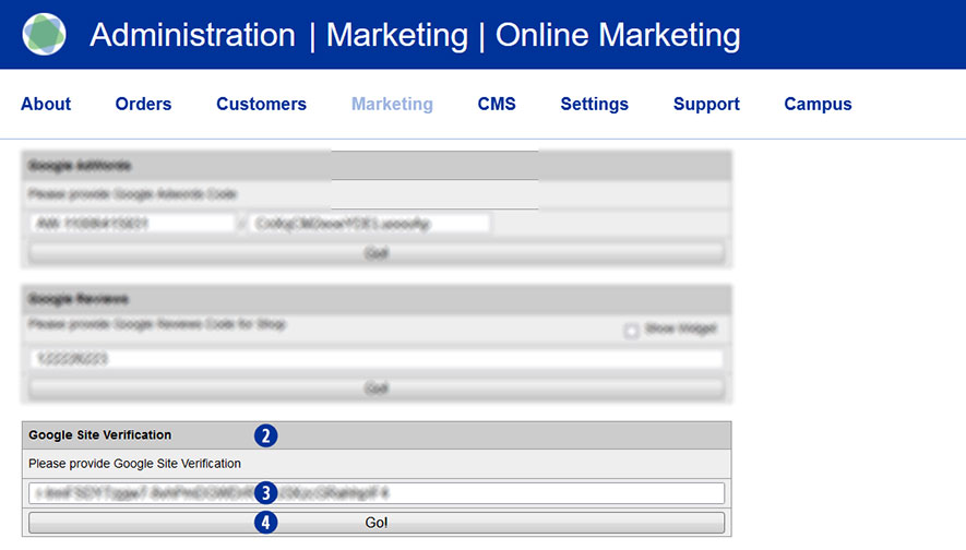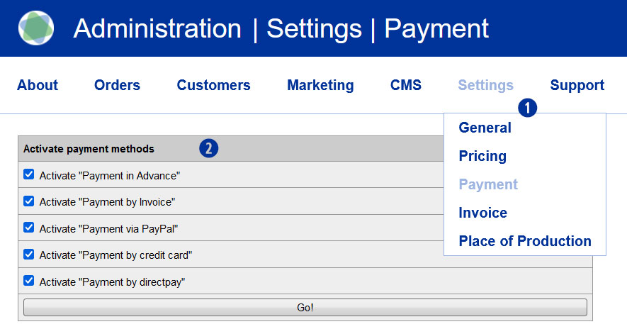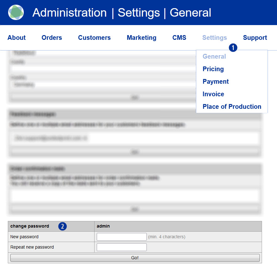 Wechseln Sie dazu in das Partnershop Backend Settings / General. [1] Im Eingabefeld [3] des Moduls „Order confirmation mails“[2] tragen Sie eine gültige E-Mailadresse ein. Bestätigen Sie Ihre Eingabe mit Klick auf den Button „Go!“. [4]