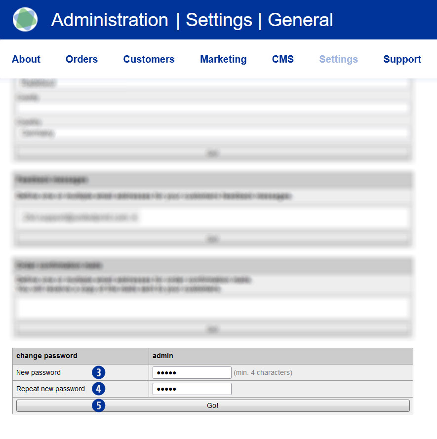 Wechseln Sie dazu in das Partnershop Backend – Settings / General. [1] Im Eingabefeld [3] des Moduls „System change reports“ [2] tragen Sie eine gültige E-Mailadresse ein. Bestätigen Sie Ihre Eingabe mit Klick auf den Button „Go!“. [4]