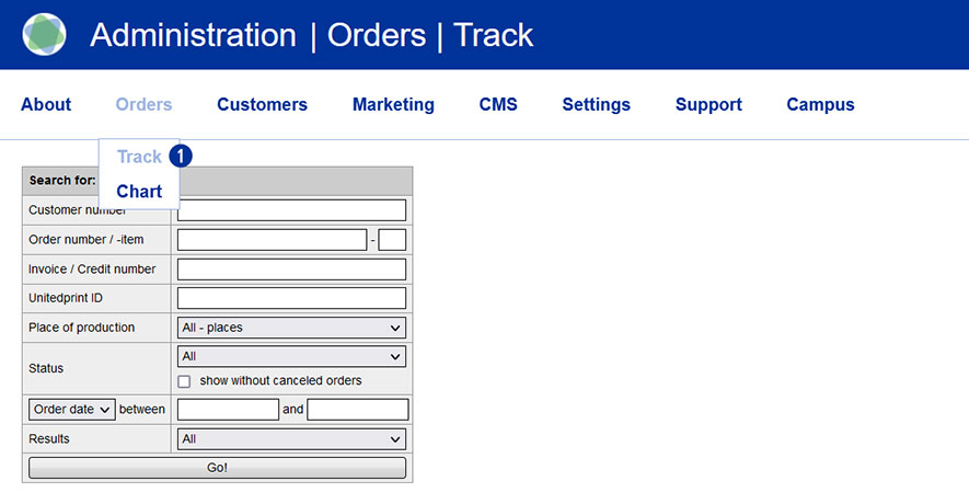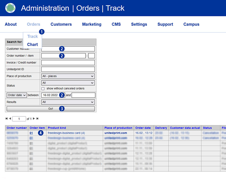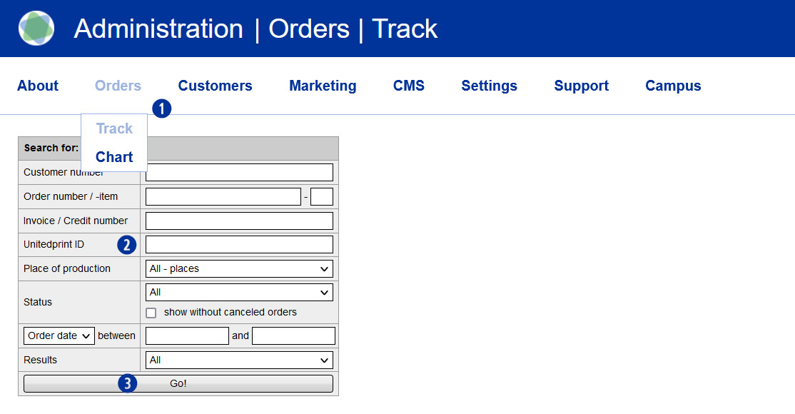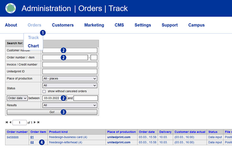 Wechseln Sie dazu in das Partnershop Backend und wählen im Menü Orders / Track. [1] Geben Sie im Feld „Order number / -item“ [2] die gewünschte Auftragsnummer ein. Bestätigen Sie die Suche mit Klick auf den Button „Go!“. [3]