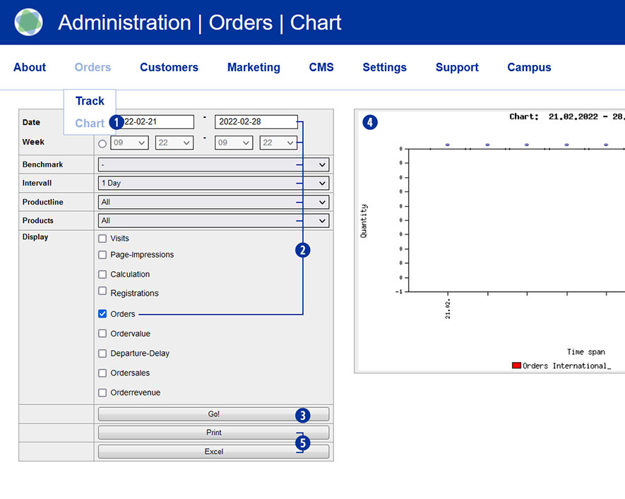 Wechseln Sie in das Partnershop Backend und wählen im Menü Orders / Chart. [1] Setzen Sie die gewünschten Parameter [2] und starten Sie die Abfrage durch Klick auf den Button „Go!“. [3] Das Ergebnis Ihrer Abfrage wird Ihnen als Diagramm dargestellt. [4]