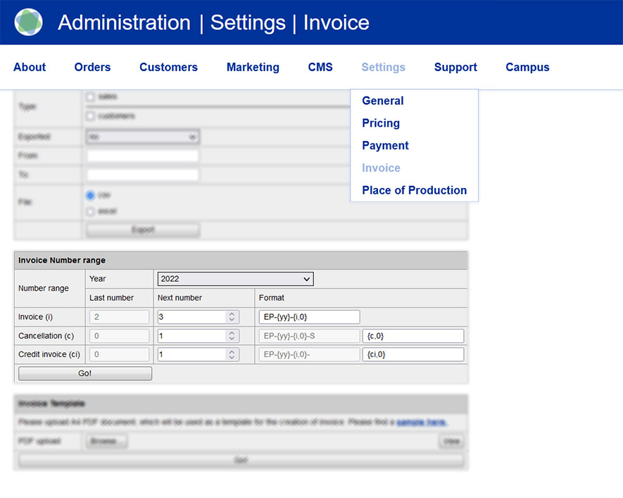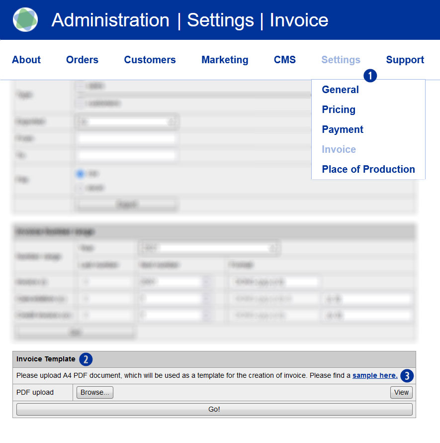 - Laden Sie in Ihrem Backend eine Rechnungsvorlage in der PDF-Version 1.4 (Acrobat 5.x) hoch. Gehen Sie hierzu in den Backend-Bereich Settings / Invoice zum Modul Invoice Template. Dort finden Sie auch eine entsprechende Vorlage.
