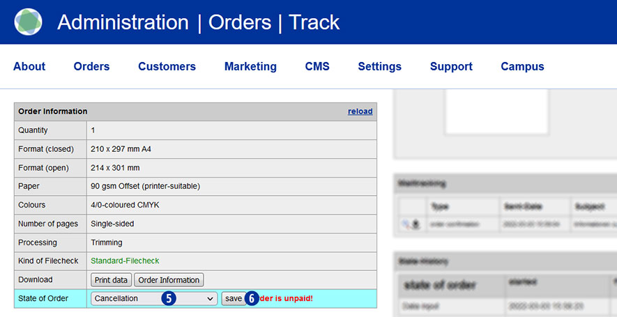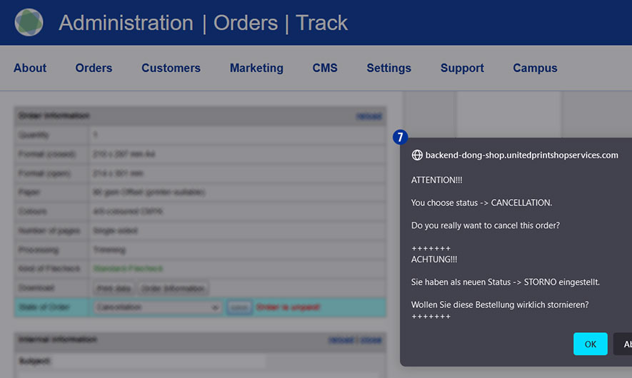 - Wählen Sie innerhalb der Detailansicht im Modul „Order information“ / „State of order“ aus der Dropdown Liste den Punkt „Cancellation“. [5]