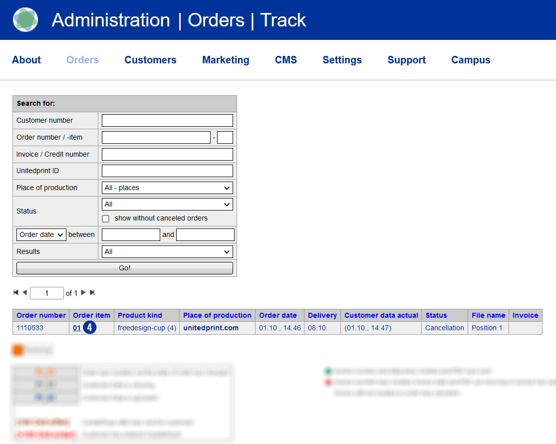 - Wechseln Sie in das Partnershop Backend im Menü unter Orders / Track [1] und wählen den gewünschten Auftrag aus.