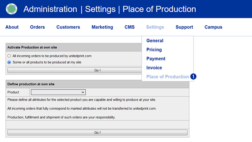 Ihr USS Partnershop erlaubt es Ihnen, Aufträge Ihrer Kunden selbst zu produzieren. Die Einstellungen hierzu nehmen Sie in Ihrem Backend unter dem Menüpunkt Settings / Place of Production vor. [1]