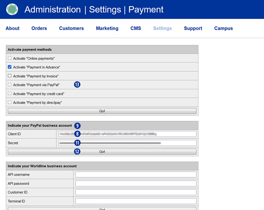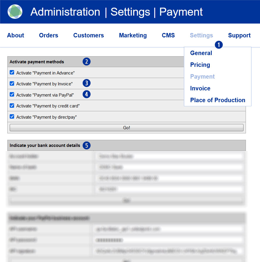 - Geben Sie Ihre Kontodaten für eingehende Zahlungen an. Kunden, die in Ihrem Partnershops per Vorkasse bezahlen, werden über diese Kontodaten informiert. Sie finden die Eingabefelder im Backend-Bereich unter Settings / Payment im Modul Indicate your bank account details.