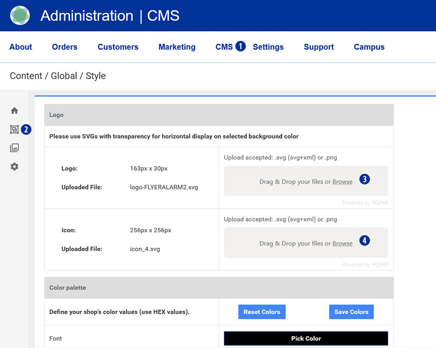 Wechseln Sie dazu in ihr Partnershop Backend – CMS / Content / Global / Style. [1, 2]