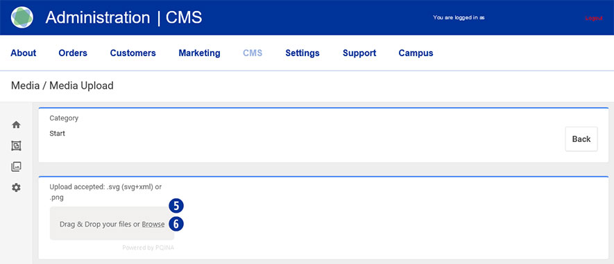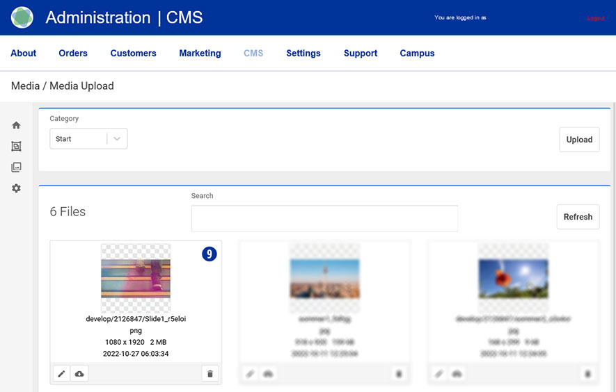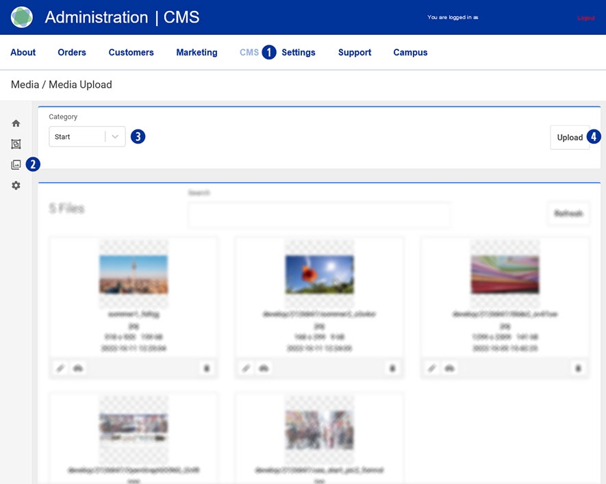 Wechseln Sie dazu in ihr Partnershop Backend – CMS / Media / Media Upload. [1] [2]