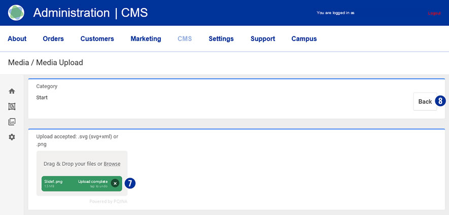 Der erfolgreiche Upload-Vorgang wird ihnen links in Form des Dateinnamens in einen grünen Button angezeigt. [7] Klicken sie rechts den Button „Back“. [8] In der Übersicht wird das hochgeladene Bild angezeigt. [9]