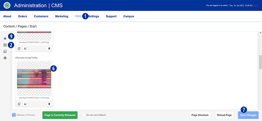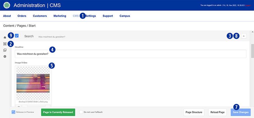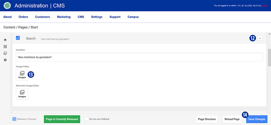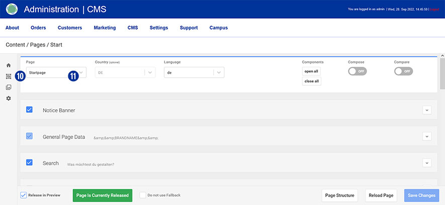 Wechseln sie über die Navigation (links) in den Bereich Content / Pages / Start. [10] Sie befinden sich auf der Seite Page / Startpage. [11]