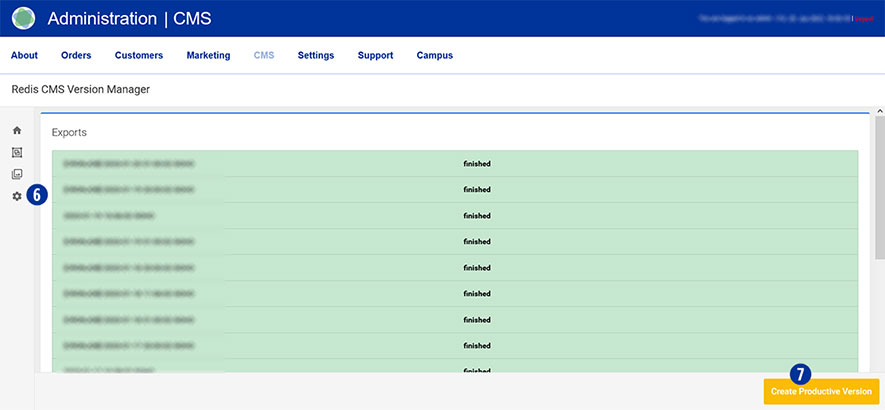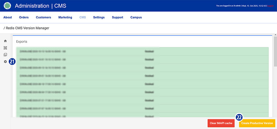 Nach Abschluss aller Anpassungen wechseln Sie im Partnershop-Backend zu CMS → Administration → Redis Management → Exports [21] und klicken dort auf den Button „Create Productive Version“. [22]