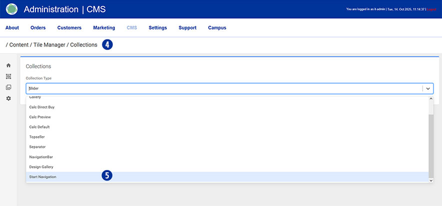 Wechseln Sie im Partnershop-Backend zu Content → Tile Manager → Collections. [4]