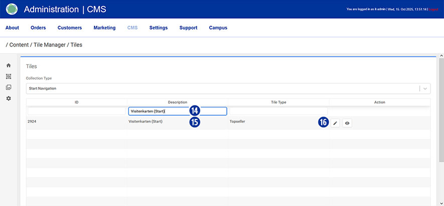 Durch einen Klick auf das Bearbeiten-Symbol [8] der gewünschten Collection (z.B. „Start Topseller“) [7] erhalten Sie eine Übersicht über die darin enthaltenen Tiles (Kacheln). [9]