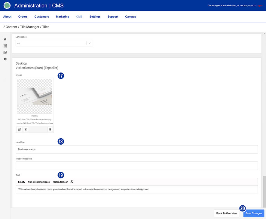 Im Tile Manager können die Inhalte für die im Shop festgelegte Sprache ausgewählt werden.